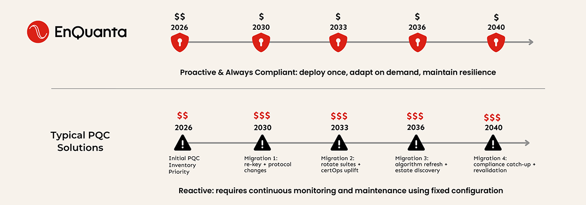 Choosing EnQuanta is a forward-looking investment that eliminates costly migration cycles. Our adaptive software-only cryptography delivers ongoing compliance, reduces operational burden, and protects against current and future Quantum+AI threats, ensuring your security strategy remains effective well into the future.